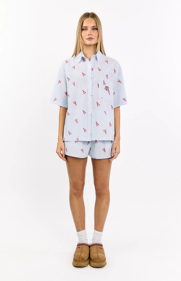 in style with our Alexea Lobster Print Pajama Shirt, the perfect choice for a comfortable night's sleep or a lazy weekend morning! This adorable shirt features a classic blue and white  fabric, a fun all-over lobster print, and a chest pocket with our signature embroidery detail. Pair it with the  shorts to complete the cute set, or wear it on its own for a comfy and stylish sleepwear look!