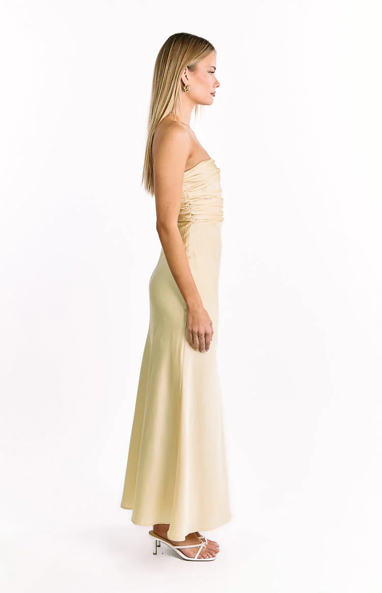 Radiate pure elegance at your next  in our Alexia Yellow Strapless Maxi Dress! This stunning gown is crafted from a beautiful  and features a structured, gathered bodice and a flowy, bias-cut skirt that moves like a dream. Perfect for prom or a black-tie , just add heels for a timeless and sophisticated look.