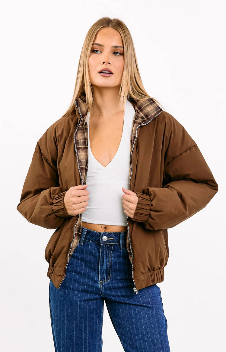Stay warm and on-trend this season in our All I Wanted Puffer Jacket, your new favourite staple for chilly days and outings. This essential features a cozy high neck, a zip-up front, and a stylish plaid lining for a touch of classic cool. Throw it on over your favourite and a basic top for an instantly stylish and comfortable look!