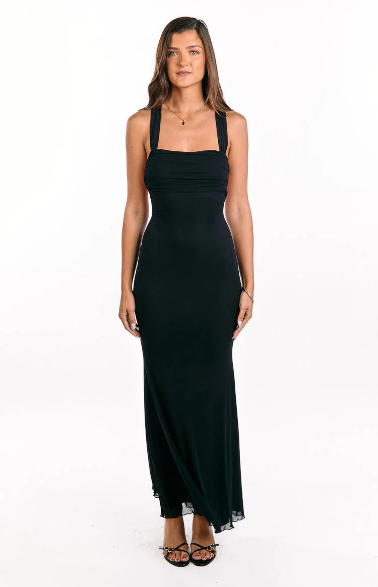 Crafted to impress, our Amberley Black Maxi Dress is a stunning choice for your next formal event. Designed with a delicate mesh overlay, this gown features a gathered bust and a captivating open back with crossover lace-up straps. Let the dress speak for itself by styling it with minimalist heels and a sleek clutch for an unforgettable prom night.
