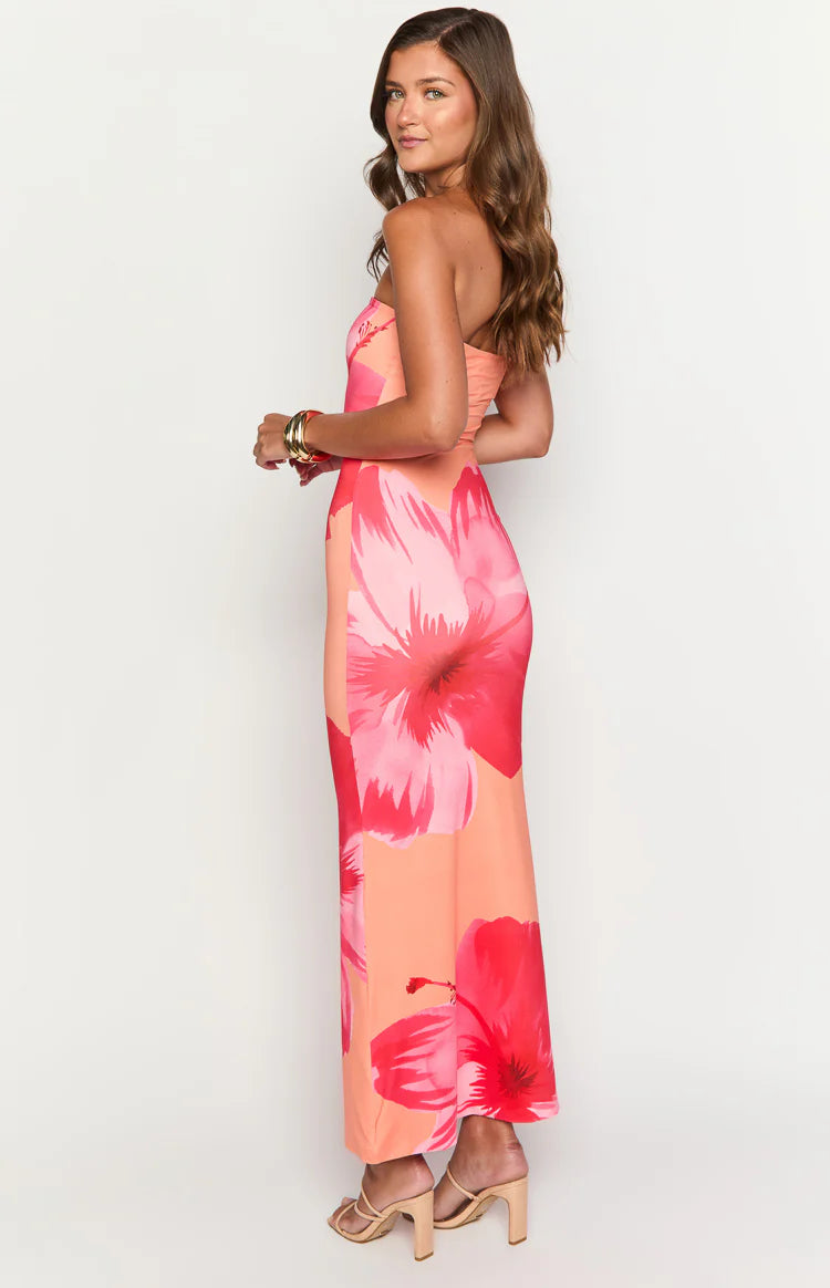 Orange Floral Strapless Maxi Dress