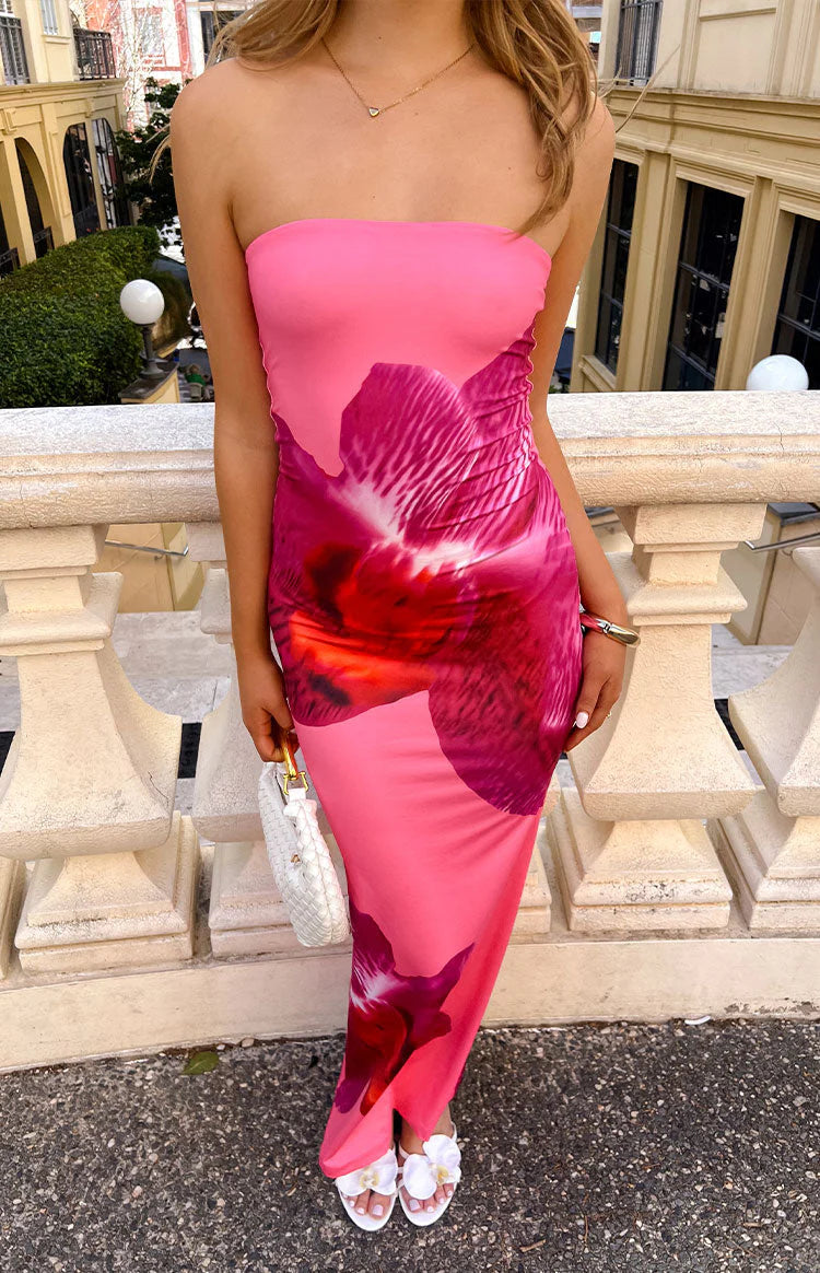 Make an elegant impression on your next  in our Arizona Pink Orchid Maxi Dress! Crafted from a stretch jersey with a bold  print, this dress features a  design and a bodycon fit that hugs your curves. For a powerful and feminine look, pair it with heels and delicate jewellery.