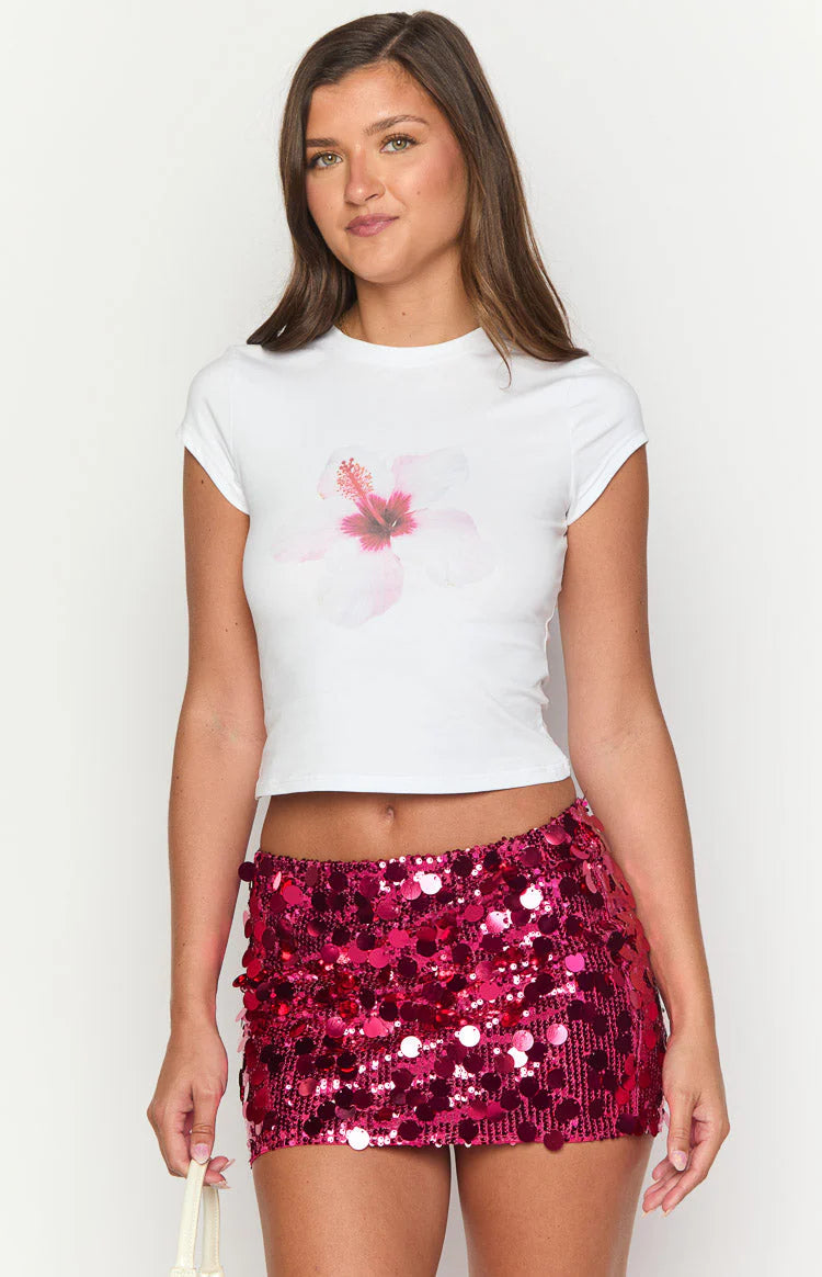 Scouting your  basics? Our Astrea White Hibiscus Baby Tee is a perfect staple piece that also adds a fun and playful look with its hibiscus . Pair with jean shorts and sandals and you're ready to hit the beach!