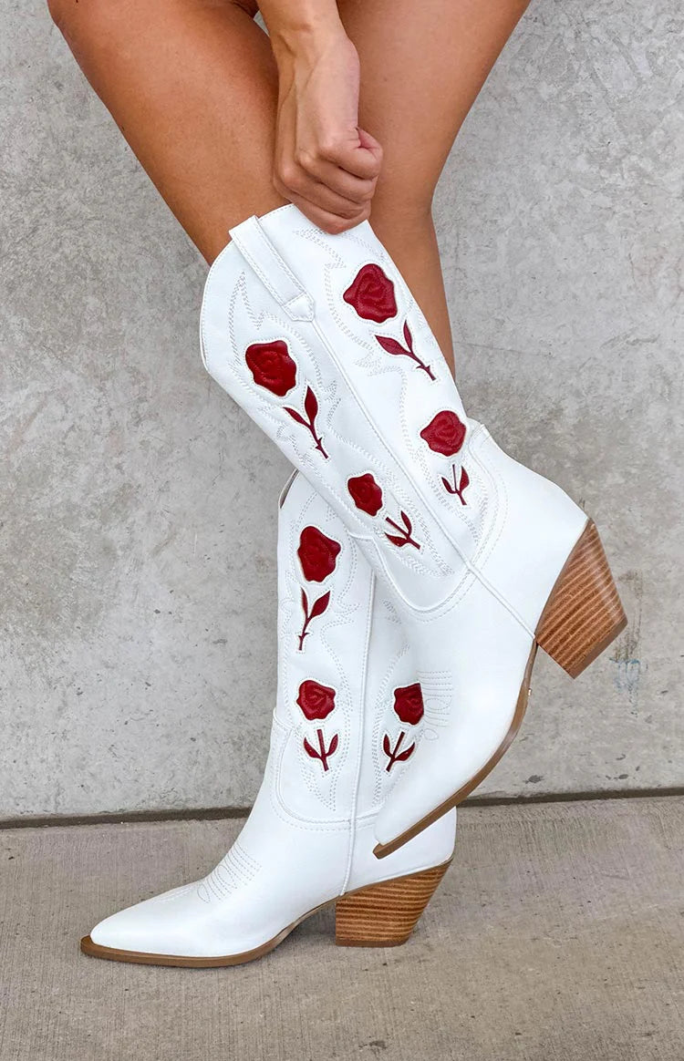 The Arden White Garnet Cowboy Boots by are the perfect blend of bold western flair and modern style! Featuring classic red rose embroidery, these boots bring an authentic cowboy vibe to any outfit. Pair them with a and accessories for your next or party to make a statement with every step.