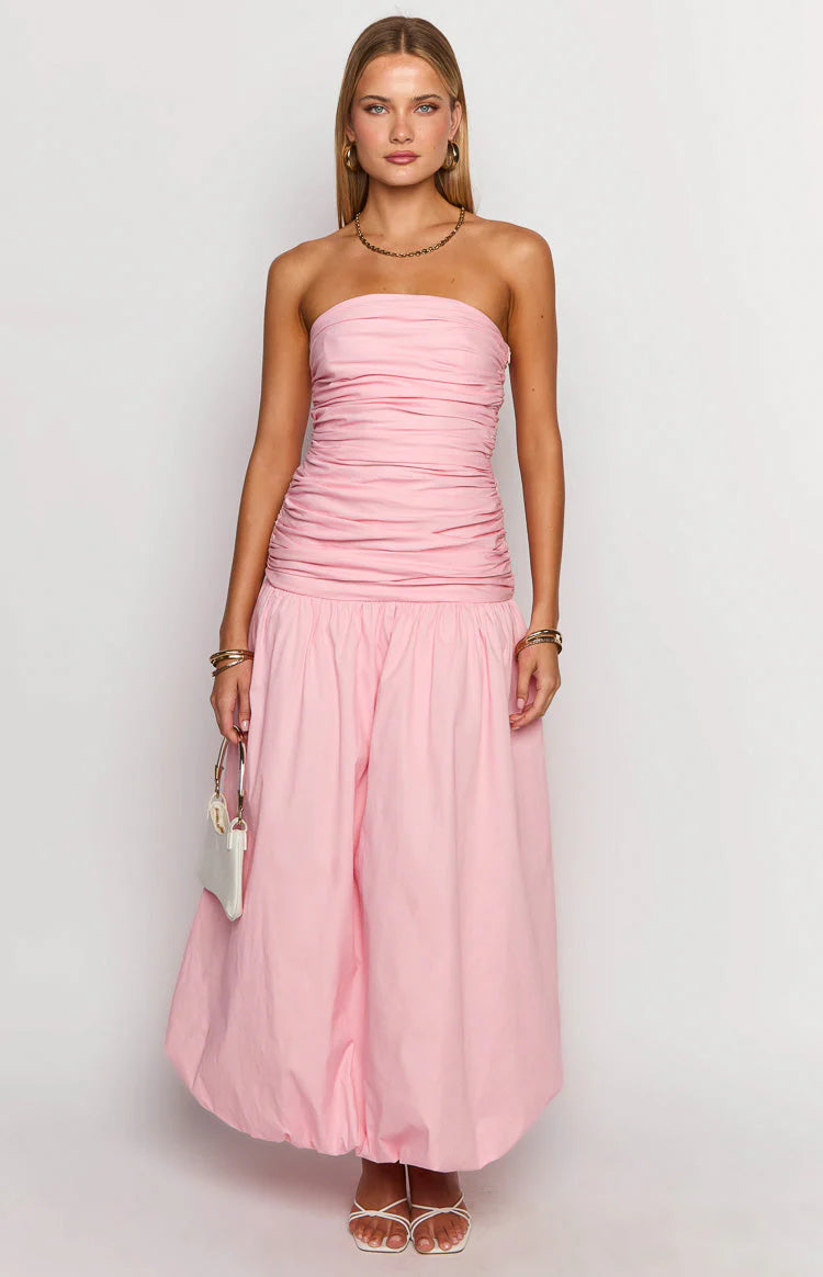 Our Boulevard Pink Strapless Maxi Dress is the perfect pretty-in-pink piece to style for your next day event! Featuring a gorgeous  neckline and gathered bodice, this dress creates a stunning silhouette completed with a bubble hem skirt. Dress up your look for  and style with nude  and your favourite !