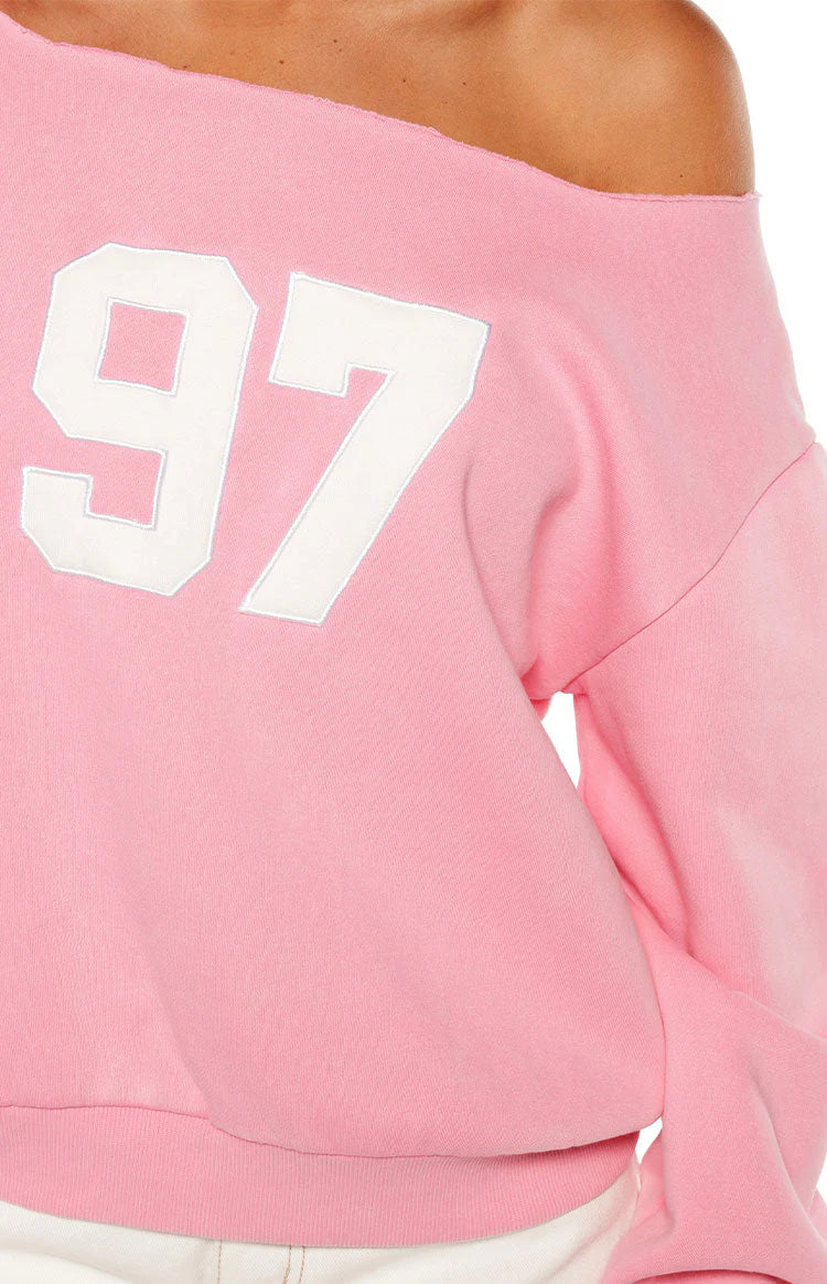 Effortless style starts here with our Buffie Pink Wash Off Shoulder Sweater, perfect for a  weekend or grabbing coffee with friends. Made from a soft fleece with a cool washed effect, it has a relaxed, oversized fit and a playful off-shoulder neckline, while the '97' appliqué and ripped details add an edgy, vintage-inspired finish. Pair it with your favourite  and  for a comfortable, laid-back look.