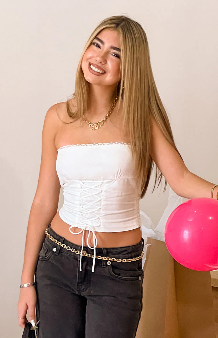 Elevate your wardrobe with our stunning Dakota White Strapless Top, a true statement piece! This elegant top showcases a sleek, silhouette and is defined by its modern lace-up waist detail, creating a look that's both polished and playful. For a sophisticated evening look, pair it with tailored and .