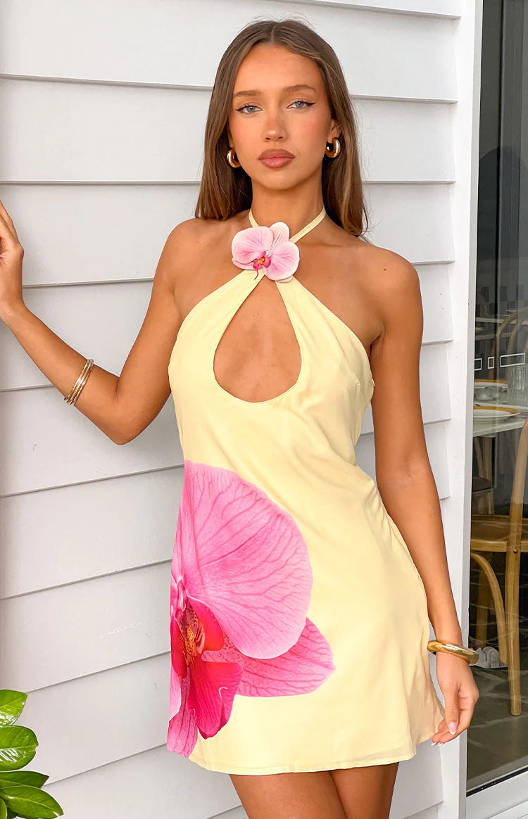 Yellow Floral Chiffon Halter Mini Dress