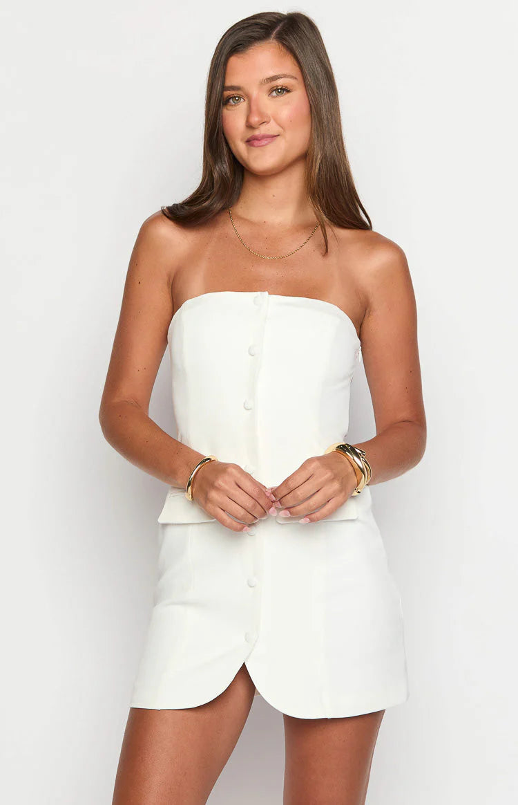The Dianna White Strapless Mini Dress is a classic wardrobe staple! This gorgeous piece perfectly blends sophistication and class. Featuring chic front buttons and a flattering silhouette, it is perfect for any semi-formal occasion or a ! Style with  or knee high boots and simple  for a polished look!