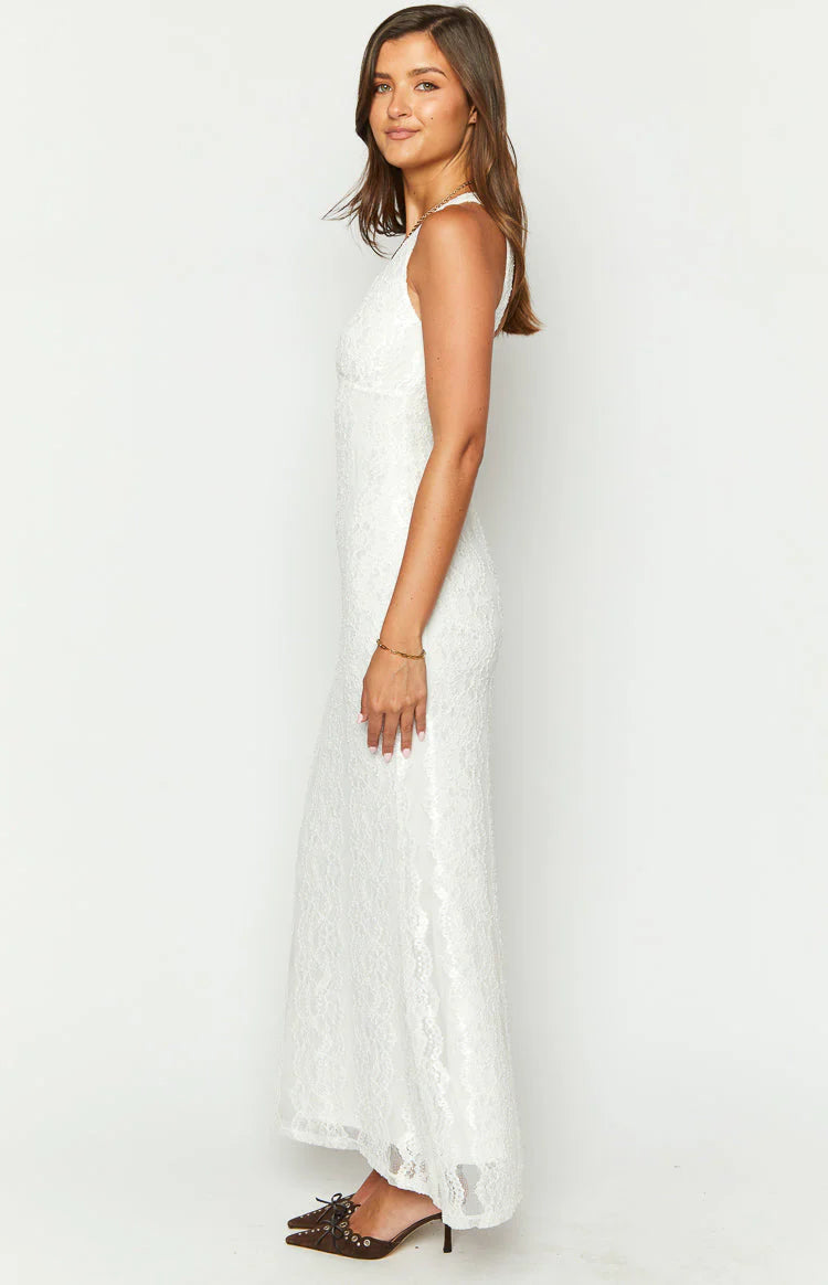 Elevate your style with the Farida White Lace Maxi Dress, perfect for events and . Adorned with delicate lace and a feminine open back cutout, this dress exudes elegance. Complete the ensemble with gold for a refined and breathtaking look.