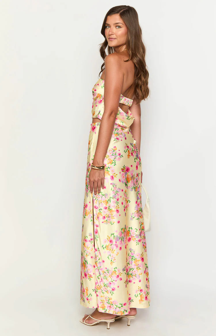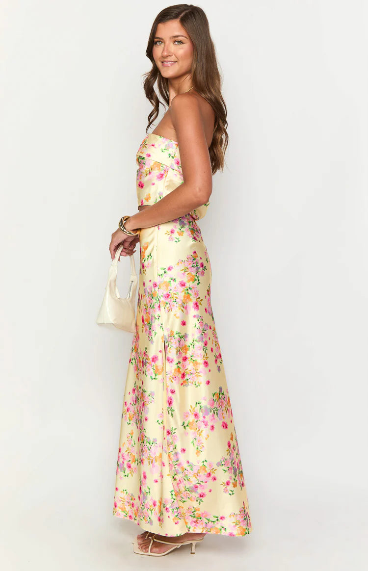 Yellow Floral Satin Maxi Skirt