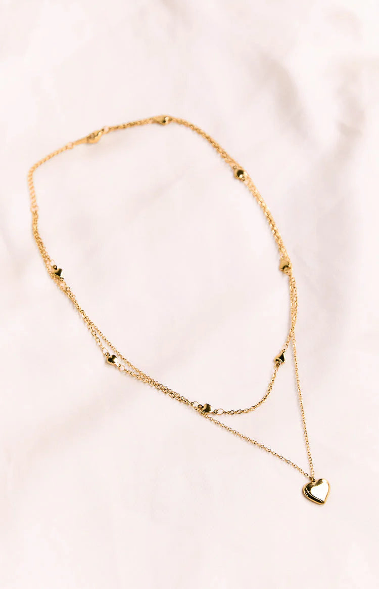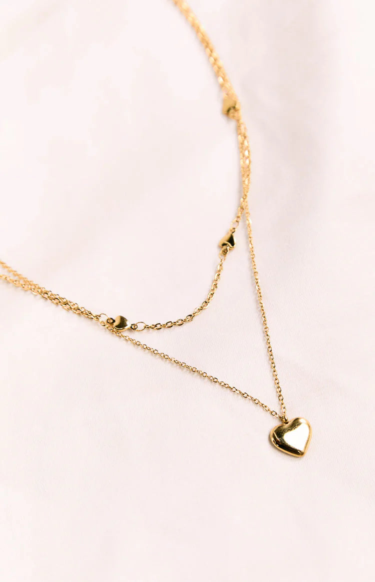 Add a touch of romance to any look with our stunning Gold Heart Double Chain ! This beautiful piece creates an effortlessly romantic and feminine look, featuring two delicate, pre-layered chains with a classic heart pendant and a mini heart charm. It's the perfect  to style with a simple V-neck top or your favourite .