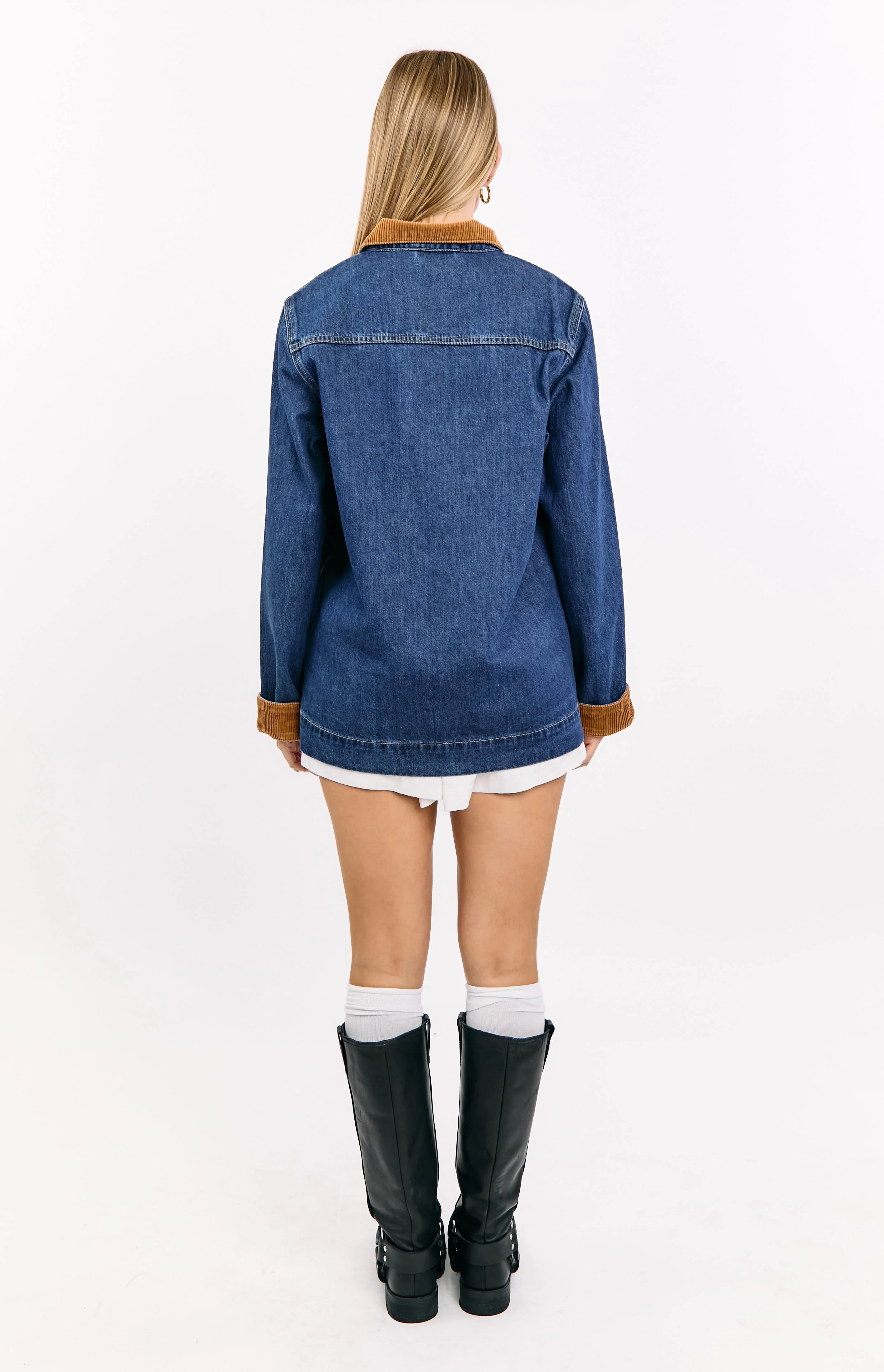 Mid Wash Denim Cord Trim Oversized Jacket