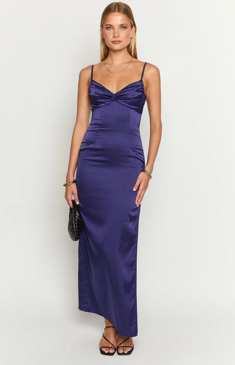 Step into elegance with the Honey Navy Maxi Dress! Featuring beautiful bust detailing and a daring side slit, this dress is perfect for making a statement at your next event. Pair with strappy and some gold to elevate the look to chic perfection.