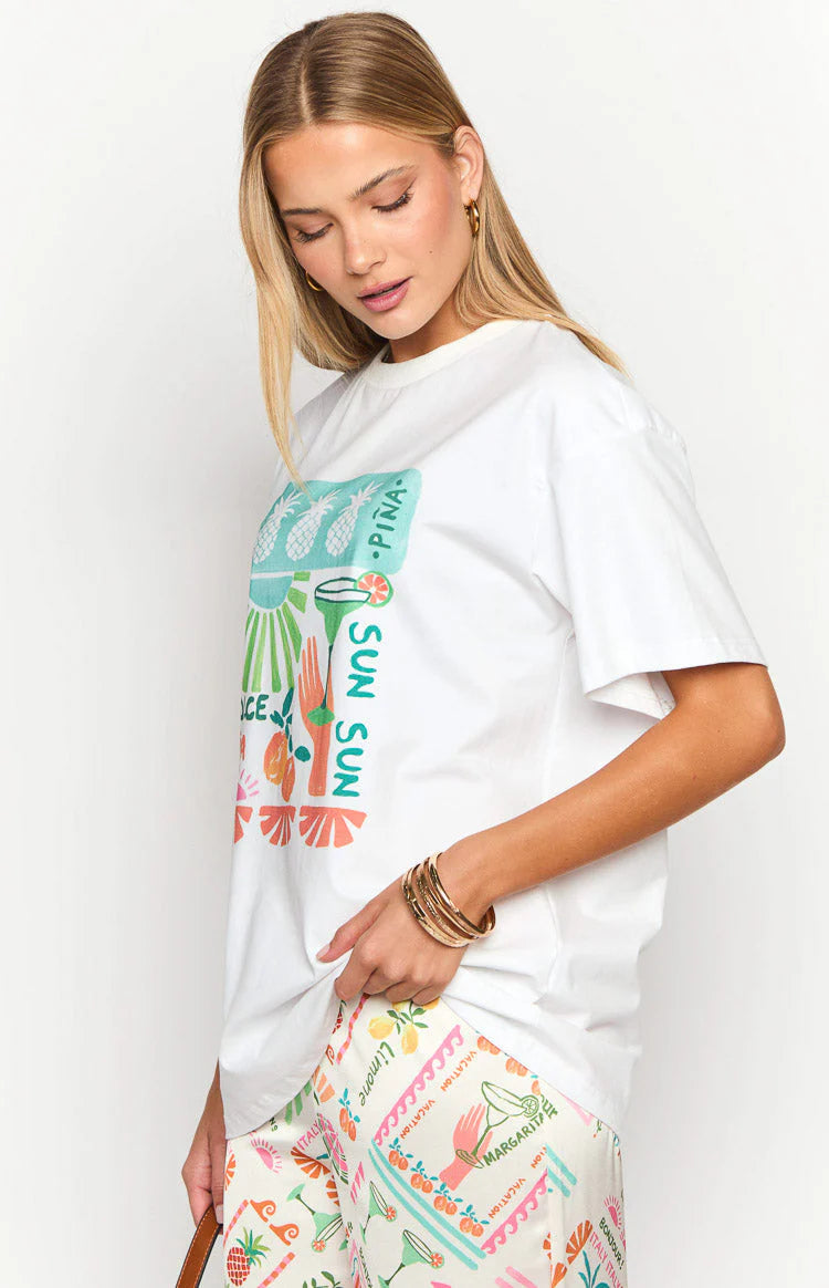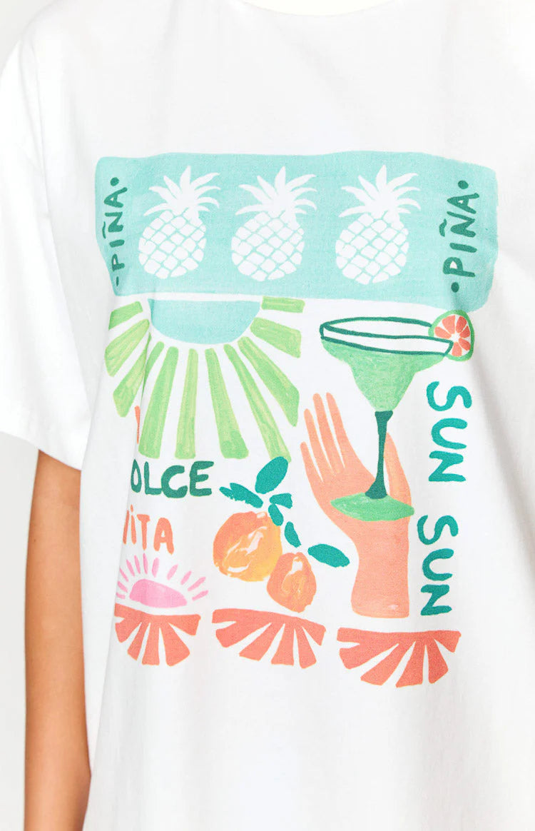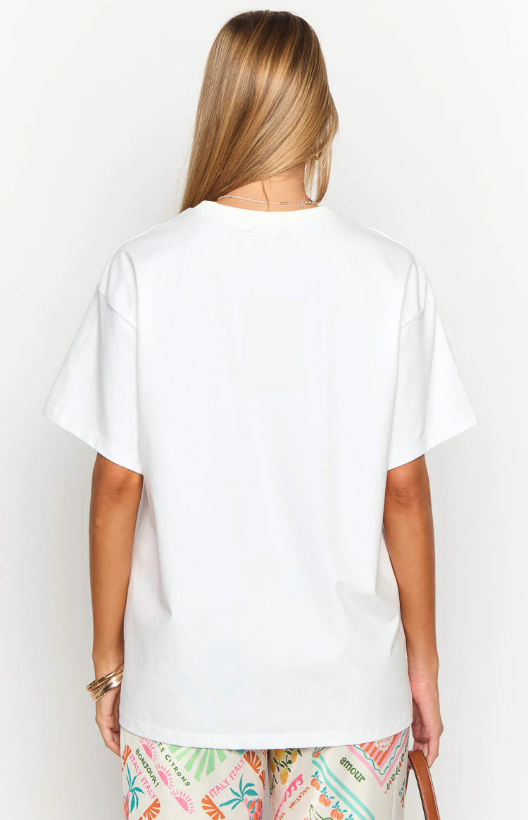 Add a touch of summer fun to your wardrobe with our Jaz Dolce Vita Print Tee! With its oversized fit and super soft cotton material, it is the ultimate comfort piece! Perfect for a casual day out, pair this white tee with and white sneakers for a classically simple look.