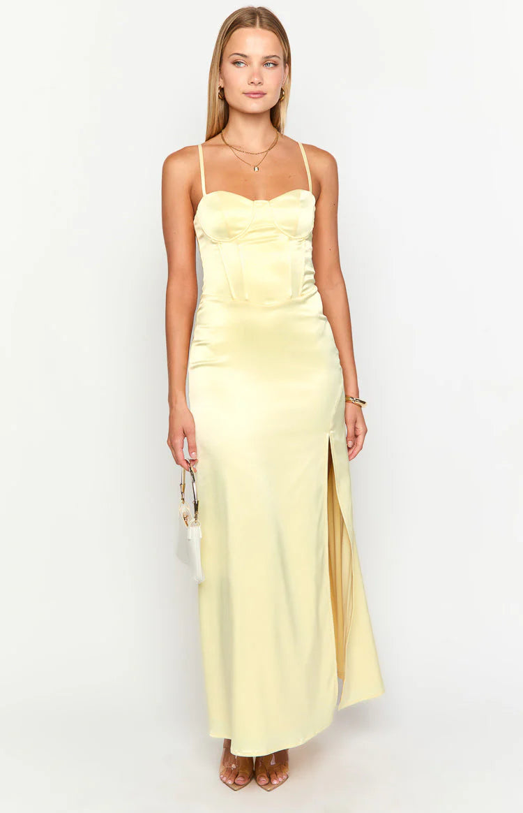 Step into the spotlight in our Lailani Yellow Corset Maxi Dress, designed to make a statement at prom or your next occasion! This dress is pure luxury, featuring a flattering corset bodice that cinches the waist and a high thigh split for a bold touch. Style it with sparkling , statement , and a metallic clutch to complete the glamorous vibe. Whether it's prom, a cocktail party, or a formal evening, this dress ensures all eyes will be on you.