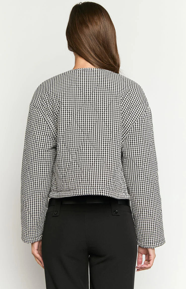 Our Lennie Black Gingham Quilted Jacket adds a vintage charm to your everyday adventures, making it perfect for layering on mornings! The timeless black print is beautifully paired with a lightly quilted texture and a sleek collarless neckline, creating a refined yet playful layering piece. For an effortless everyday look, style it with a simple white and sneakers.