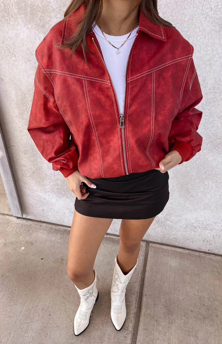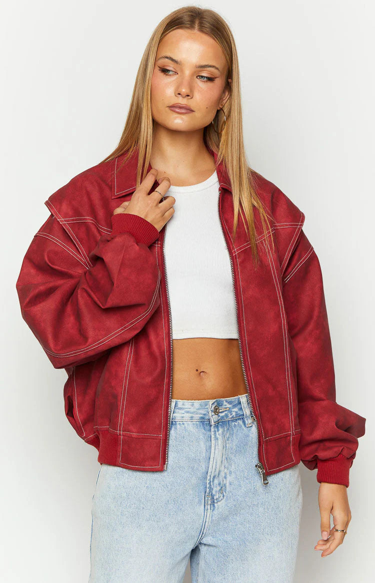 Elevate your outfit with this crimson bomber ! The perfect addition to any outfit - place over a s for dinner with the girls or jeans for a day out shopping.