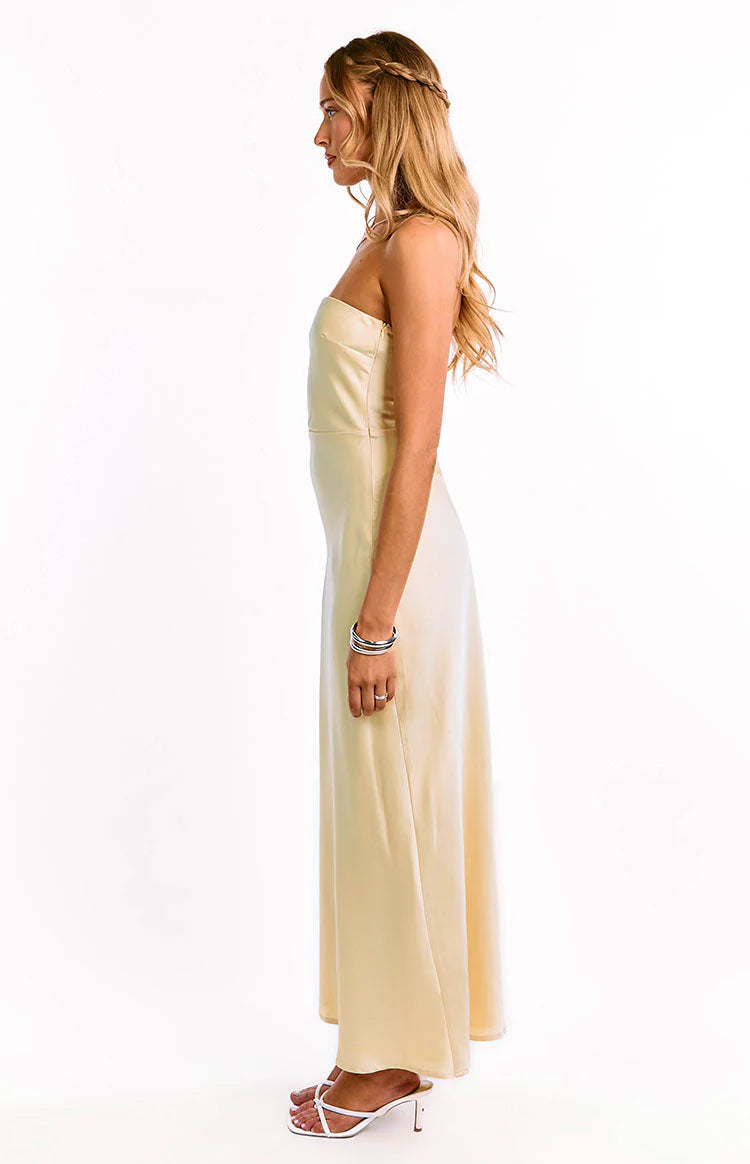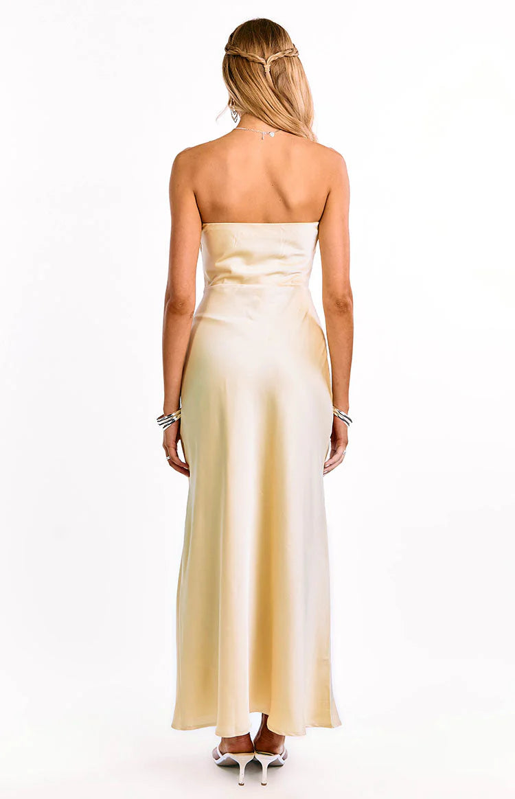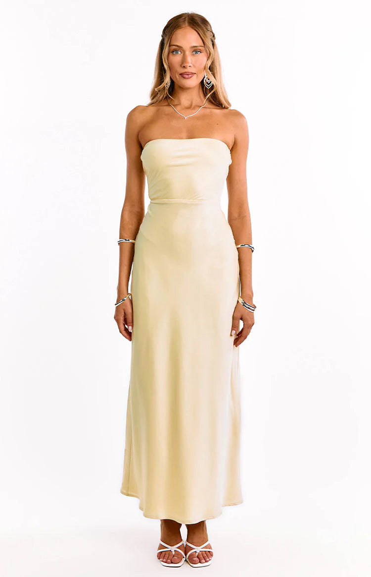 Step into sophistication at your next  event in our stunning Maddix Yellow Strapless Maxi Dress! Crafted with an elegant bias cut, this gown drapes beautifully over your figure, creating a timeless and flattering silhouette. Complement the soft yellow hue with delicate gold , tying your look together with  for a polished finish.