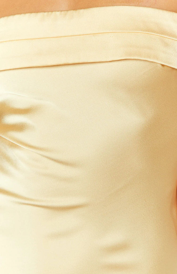 The perfect for the spring and summer seasons! The stunning pastel yellow adds a pop of colour to this classic strapless . Elevate the look with dainty gold and nude strappy heels.