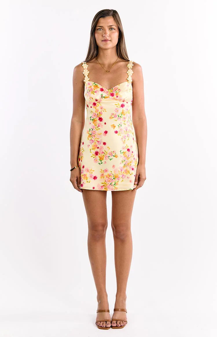 Radiate summer romance in our Marbelle Yellow Bloom Mini Dress, perfect for garden parties and warm-weather getaways. This enchanting dress is defined by its delicate floral strap detailing, complete with a classic sweetheart neckline and a flowing bias-cut skirt. Let the details shine by pairing it with simple nude heels for a beautiful and unique homecoming look.