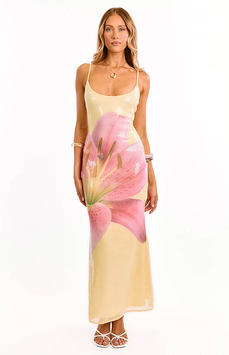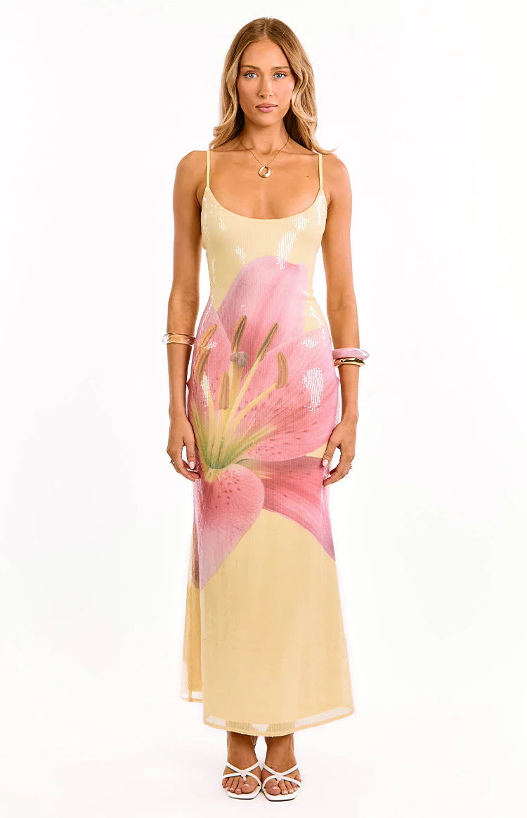 Radiate romance at your next  event in our Marchelle Yellow Floral Sequin Maxi Dress! This stunning gown features a flattering scoop neckline and is covered in wet-look  for an elegant, confident feel. Complement the look with your favourite heels and dainty .