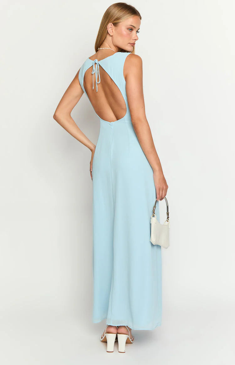 Make a statement at your next or cocktail event with our stunning Misty Light Blue Chiffon Maxi Dress! Featuring a flattering cut and an open back design, this dress is the perfect blend of elegance and allure. Complete your look with white and in your favourite metal for an effortlessly chic finish.