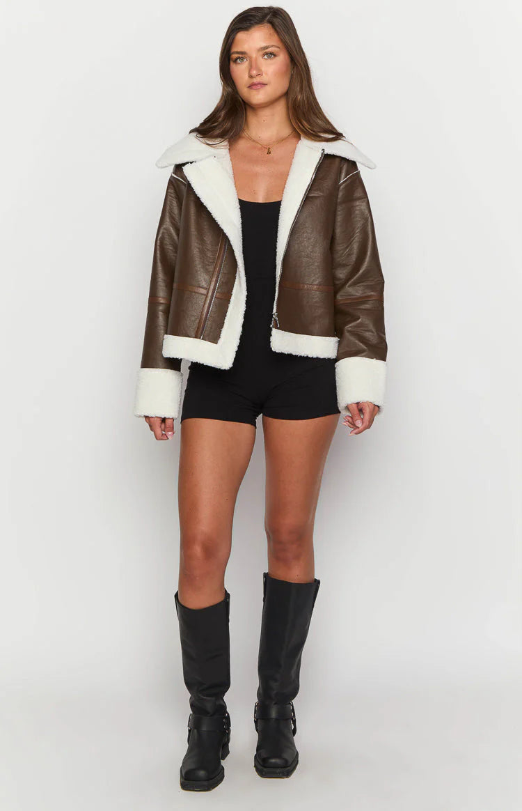 Our Myki Brown Sherpa is the perfect addition to your wardrobe! With an oversized collar and sherpa lining: its the perfect combination of style and warmth. Pair with jeans for a daytime outing or throw it over a dress for your next night out.