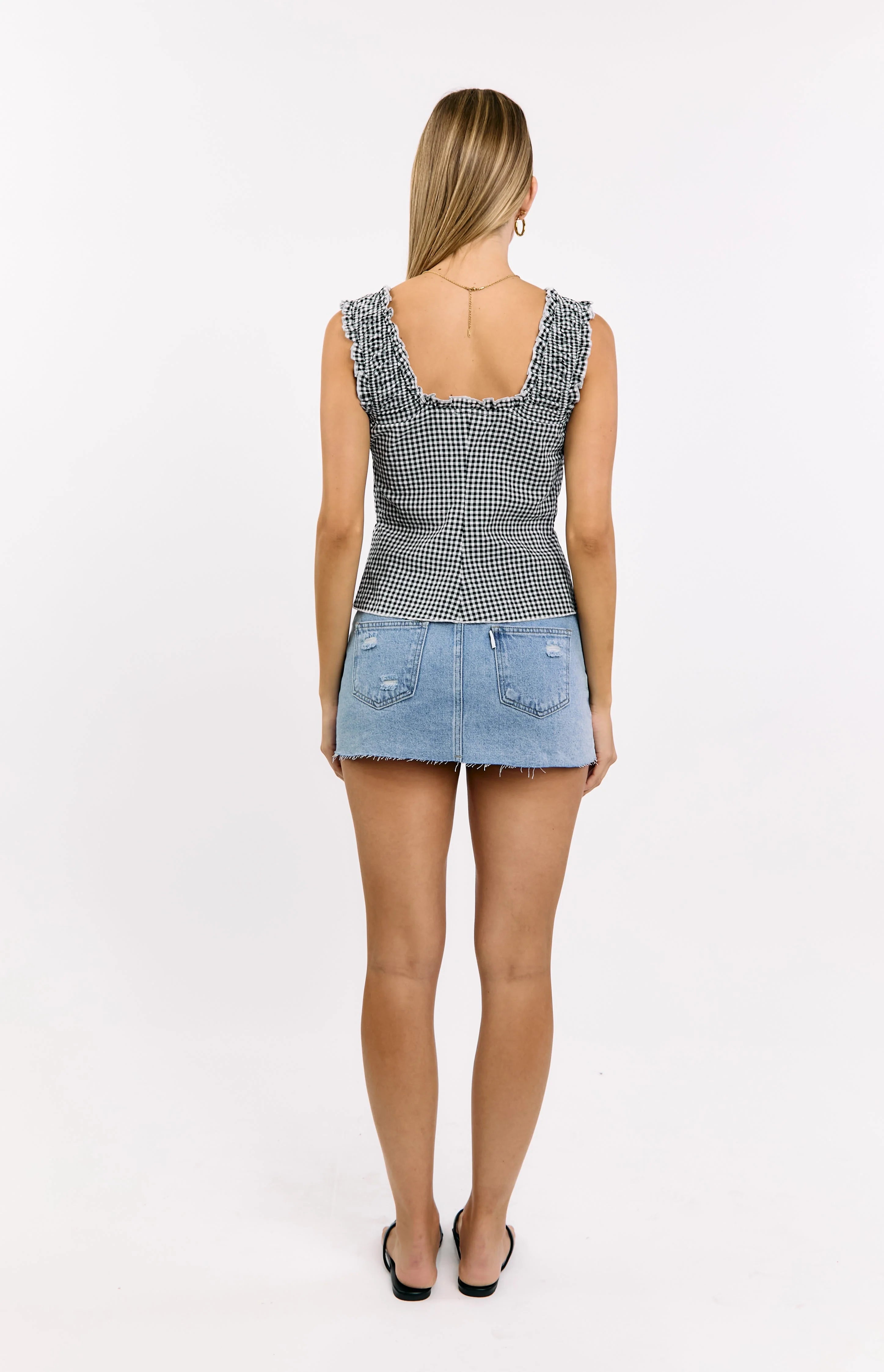 Look effortlessly sweet in our Neevie Black Gingham Top, the perfect piece for picnics, brunch dates, and sunny day adventures. This adorable top features a classic print, sweet ruffle detailing on the straps and neckline, and a multi-tie front. Pair it with your favourite skirt or shorts and some cute sandals for the perfect outfit.