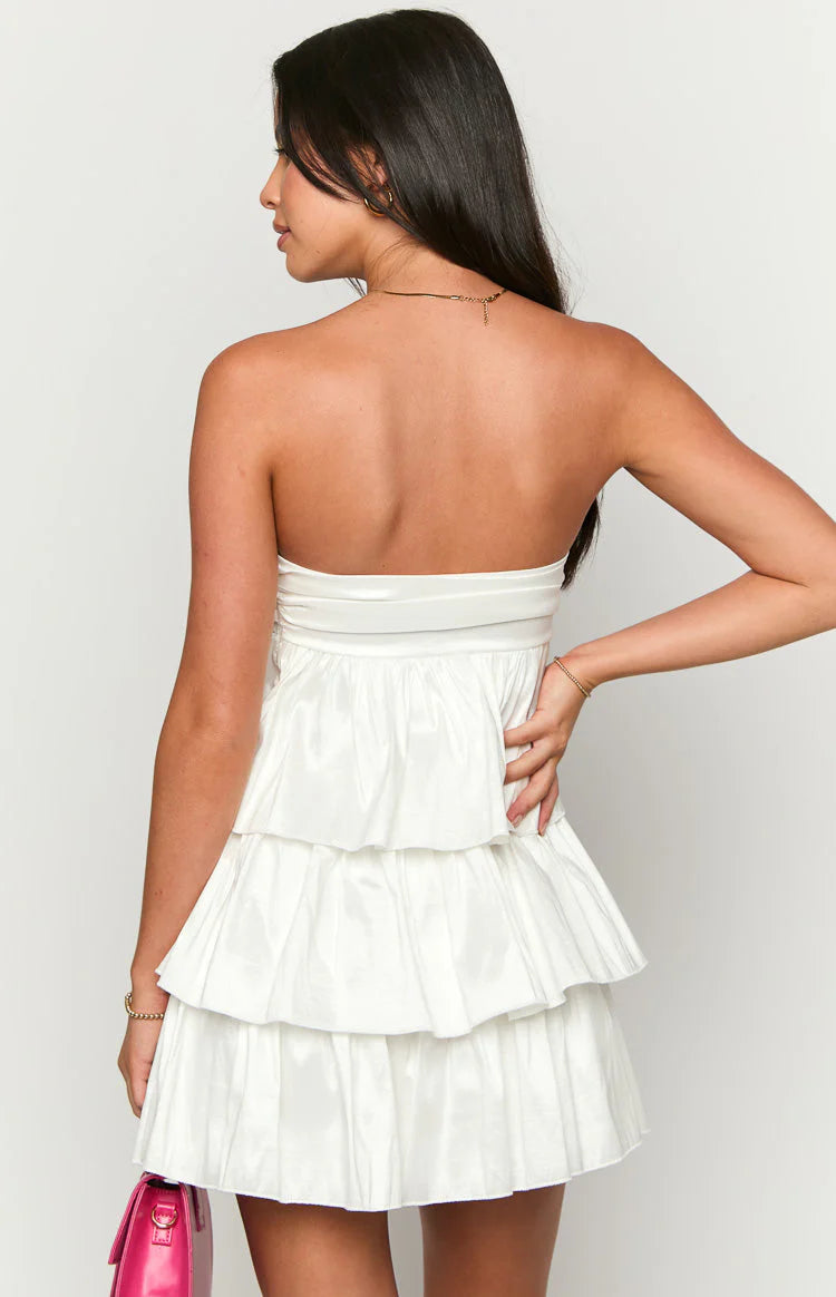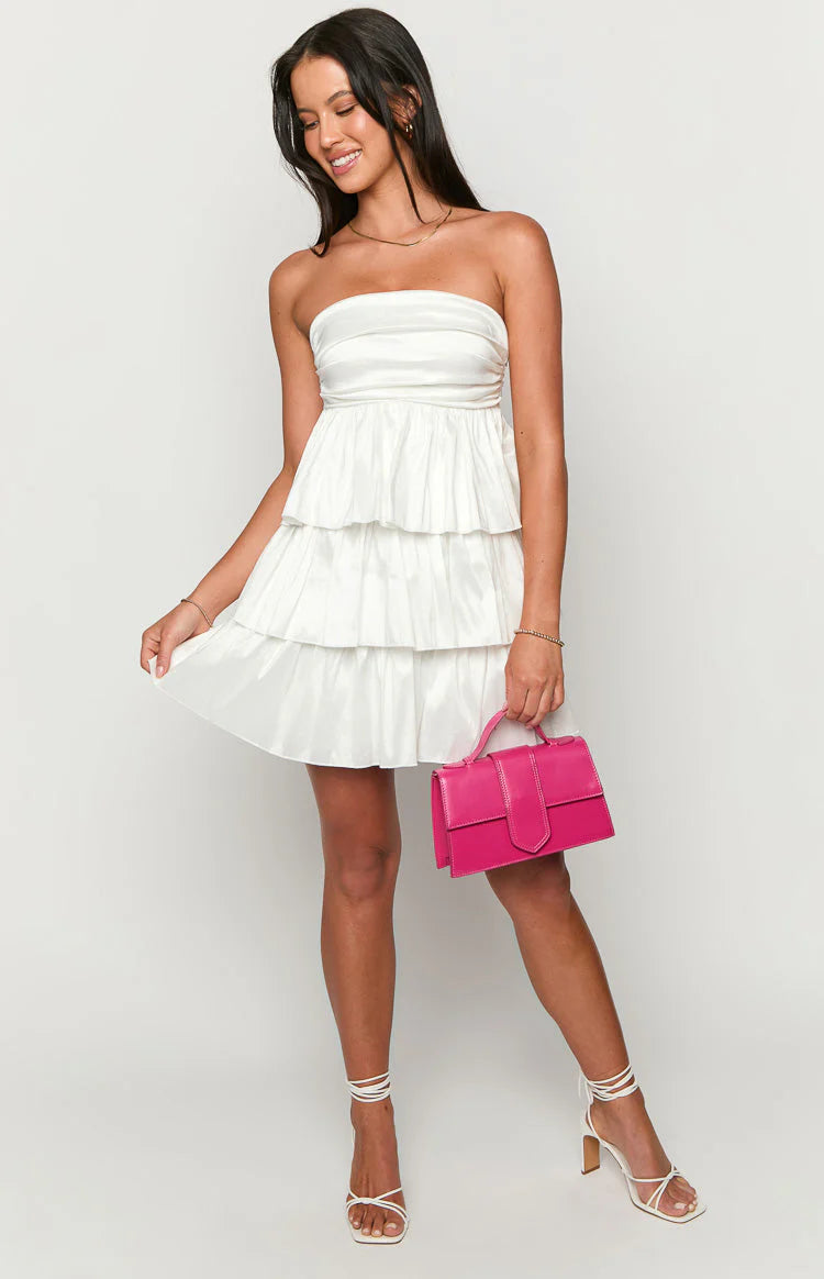 The One Wish White Strapless Mini Dress is to die for! Featuring the cutest tiered ruffle silhouette and strapless style, this dress is perfect for  in the  time. Finish your look with gold  and white strappy heels!