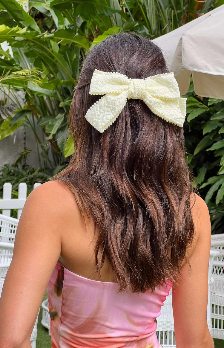 Our Penelope Cream Bow Hair Clip is the ultimate finishing touch for an adorable look! Made from a textured cream fabric and embellished with pearl beads around the border, this stunning hair  can be added to any outfit. Style with a  and heels for a sweet date night look or keep it cute and casual with a  and some jeans!