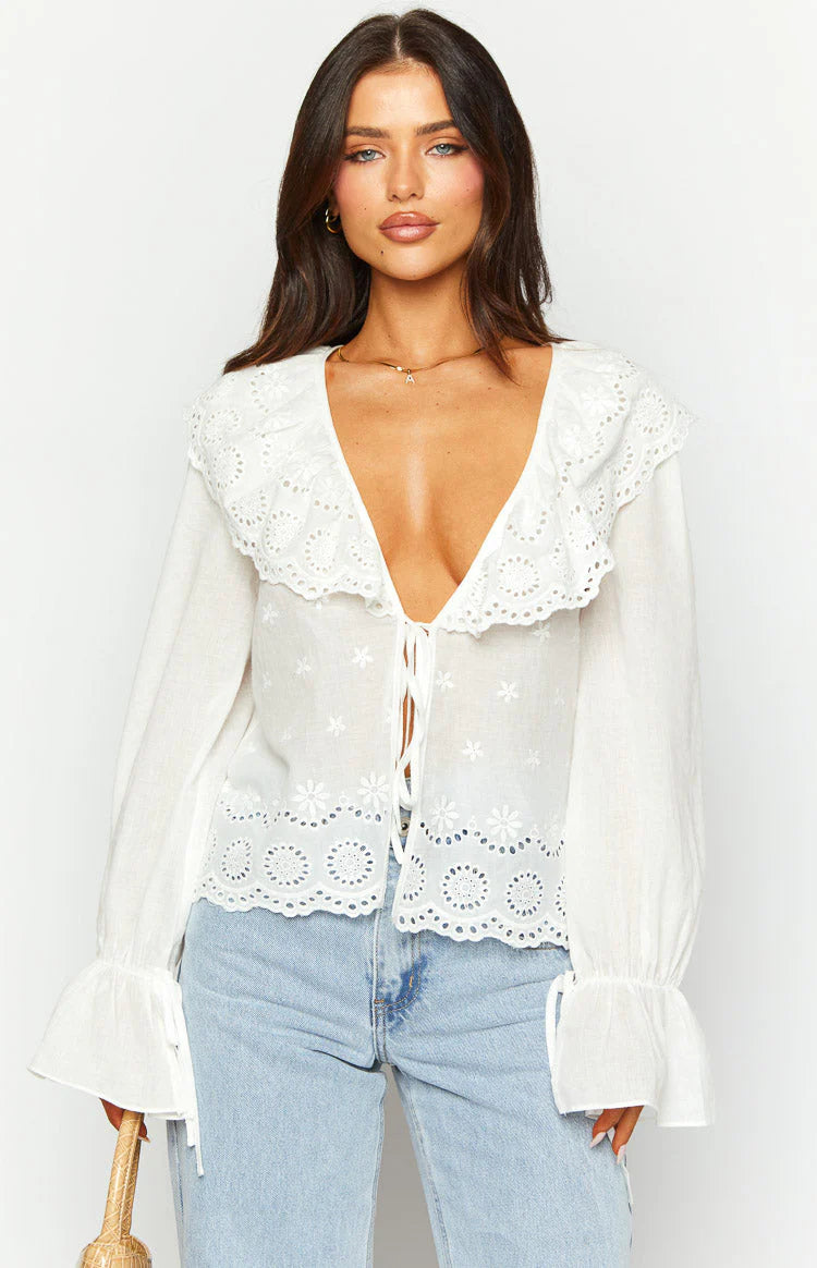Looking for a long sleeve yet stylish festive top? This poppie white top has a beautiful embroidery detail that gives out a cute unique look! Pair it with white shorts or jeans with knee high boots and you are ready to go.