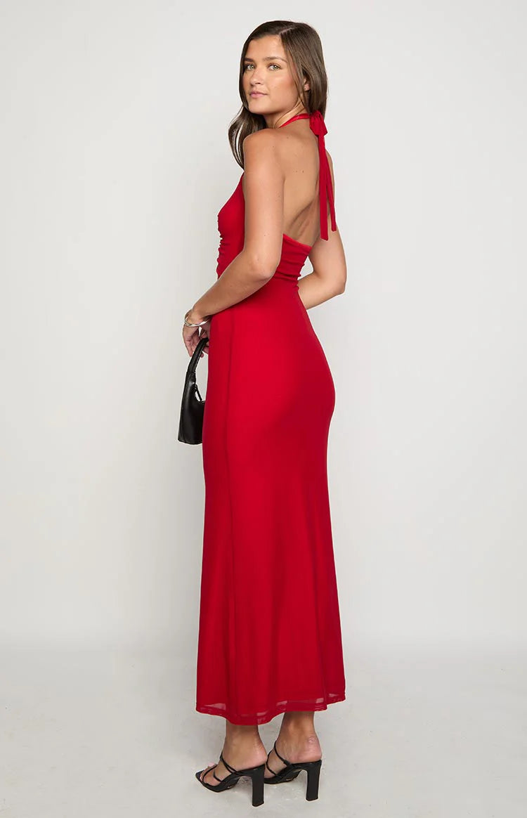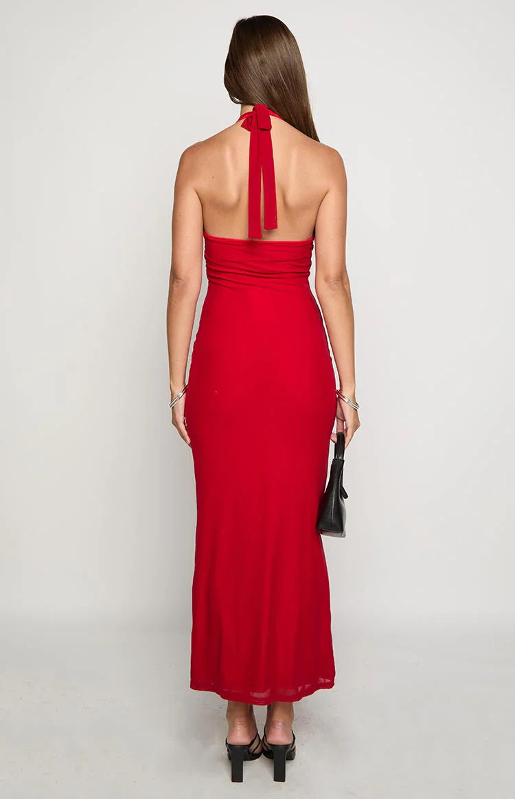 Turn heads in our Raymin Red Maxi! This stunning dress features a tie, wire plunge neckline, and a gorgeous vibrant red fabric. Dress it up with heels and striking gold , and you'll be ready to shine at your next .