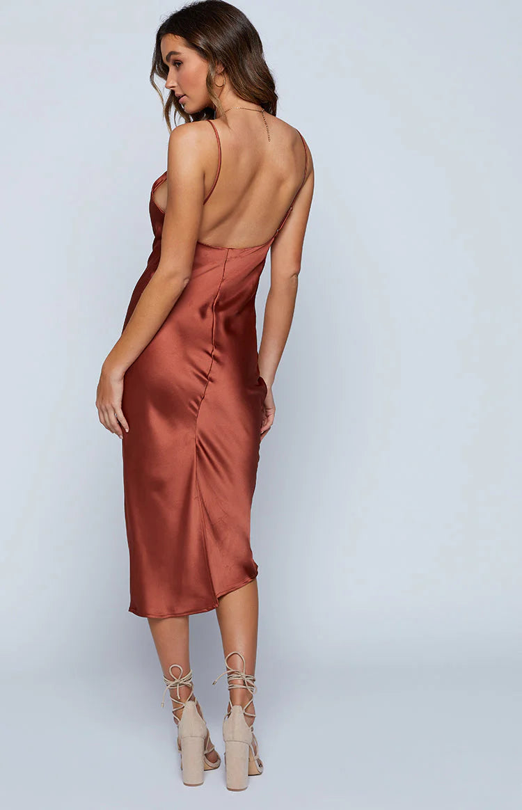 The Schiffer Slip  in rust is the perfect satin dress for any formal occasion! Featuring a stunning cowl neck this piece is sure to be your next wedding guest or  outfit. Elevate by styling with with heels, a black bag and gold dainty jewellery!