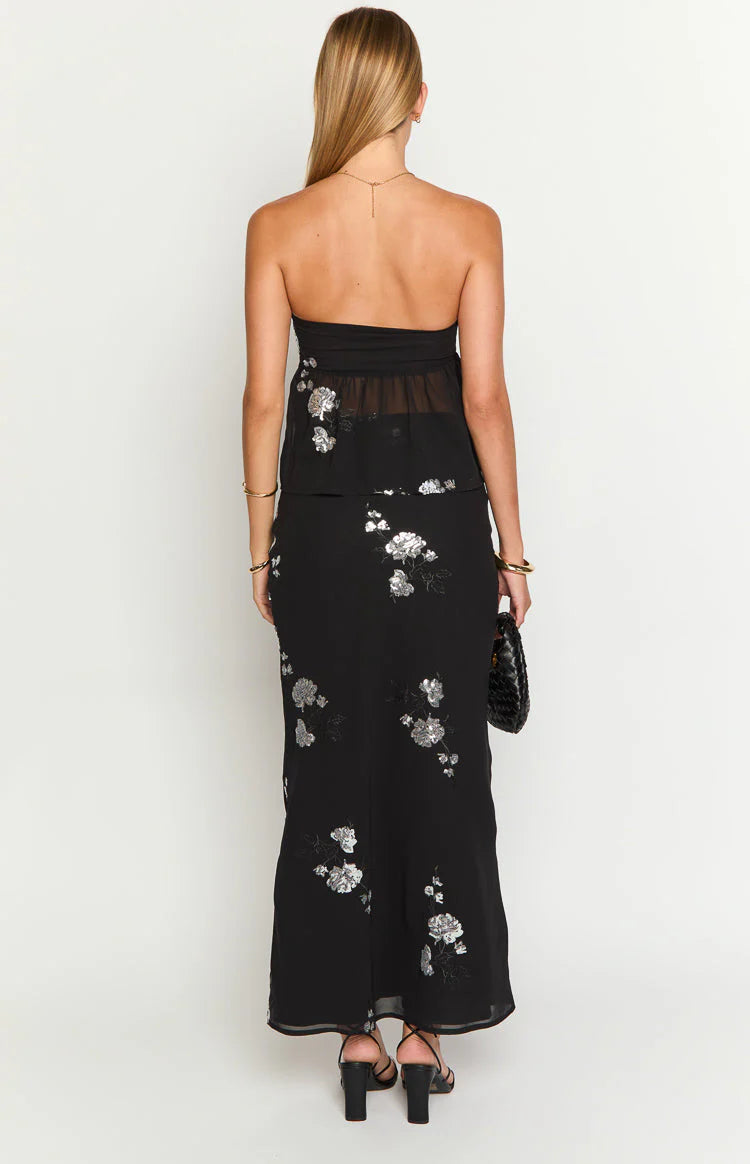 Add a touch of glamour to your wardrobe with our Shyla Black Sequined Floral Print Maxi Skirt! Featuring a stunning floral embroidered design with sequin detailing, this skirt is perfect for a  or a special event. Pair it with the matching Shyla Strapless Top for a , finishing with black  and silver jewellery to tie your look together!