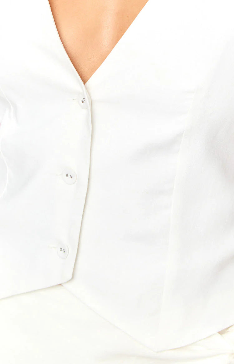 Our Sofi White Vest Top is the perfect blend of clean tailored comfort! With it's luxe material and tailored silhouette, this top adds a touch of sophisticated charm to any look! Pair with our Flora White Linen Shorts for a , finishing your look with a and matching heels to tie it all together.