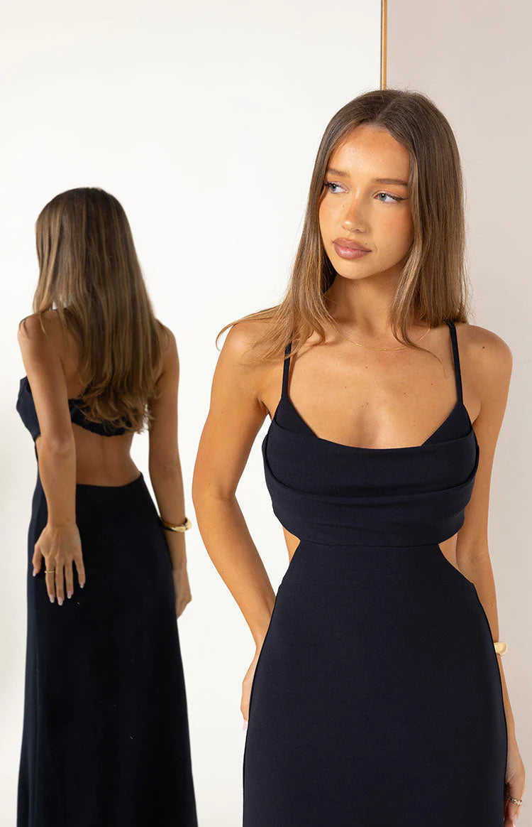 Step into sophistication at your next event in our Taleah Navy Crepe Formal Maxi Dress! Crafted from a stretch crepe material, this elegant features side cut-outs and a striking open back, creating a stunning silhouette. For a polished finish, simply add a pair of and a statement clutch.