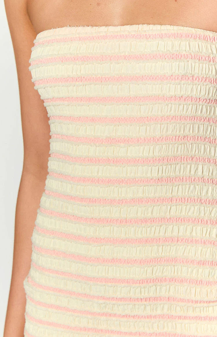 Slip this strapless with heels and gold and you are ready for vacation! Feel extra beachy by styling with and a straw tote.
