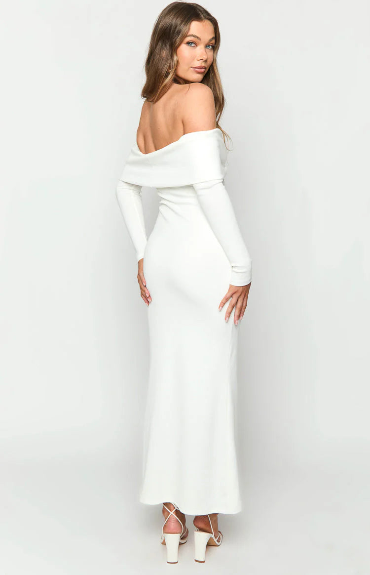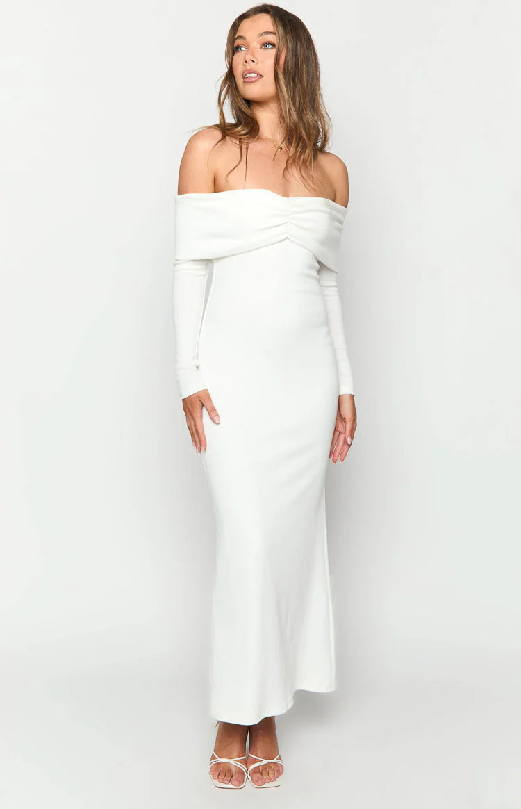 Radiate elegance in our Tuesday long sleeve . This dress is perfect for a formal event or a sophisticated evening out. Style with strappy and a sleek clutch for a timeless look. Accentuate the gorgeous off shoulder neckline with a statement !