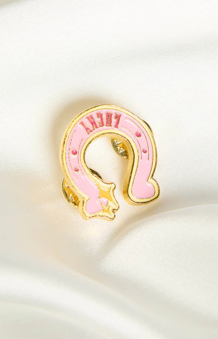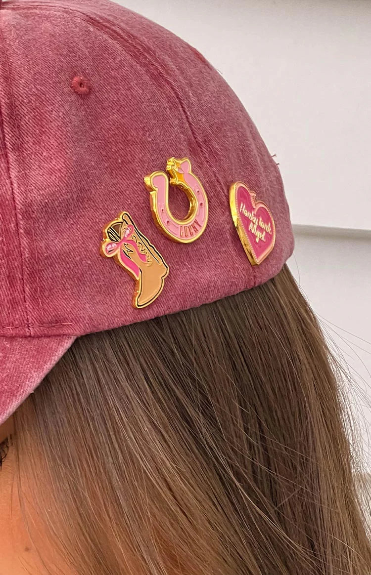Our Western Pins 3-Pack adds a fun and bold statement to any outfit! Featuring a mix of pink, brown, and gold designs, this set includes a lucky horseshoe, a pink heart honky tonk angel, and a pink bow cowgirl boot, all adorned with chic gold hardware. Perfect for adding a playful touch to denim , , or , these pins bring a bit of Western charm wherever you go!